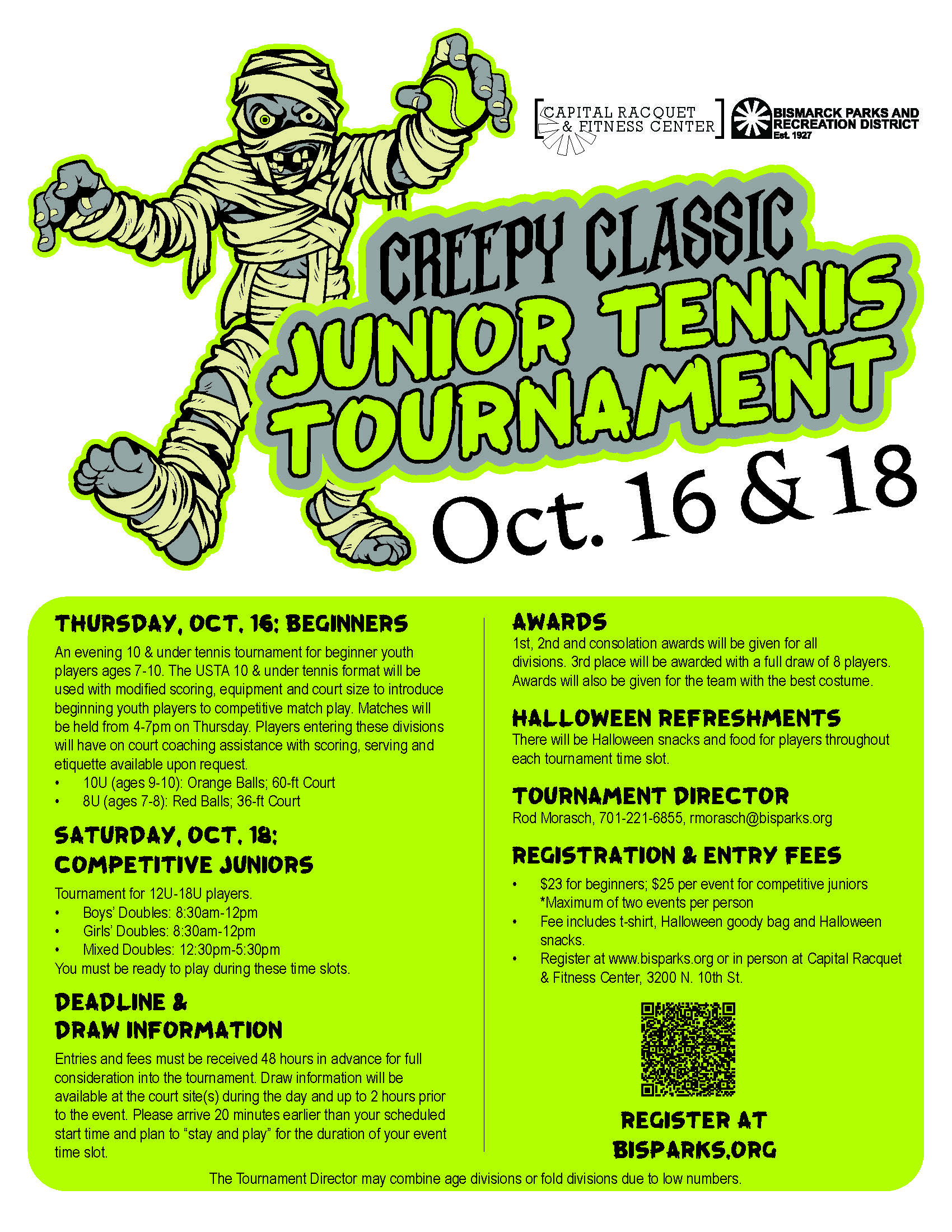 Creepy Classic Tennis Tournament Thursday, Oct. 16 (Beginners) Saturday, Oct. 18 (Competitive) Capital Racquet & Fitness Center, 3200 N. 10th St.