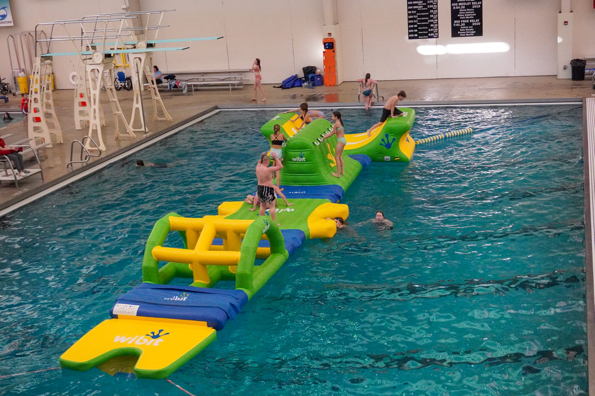 Enjoy inflatable water toys for ages 6+ in the dive well many Saturdays and Sundays September through May. You must pass a swim test to participate – see Wibit rules below. Always check the calendar before heading to the pool.
